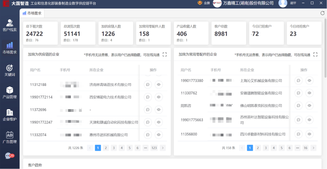 利用“大国智造”客户端,为供应商提供精准 BtoB 销售线索,与潜在客户直接对接,由被动等待信息转变为实时主动营销,及时掌握客户需求,及时推送线下跟踪。