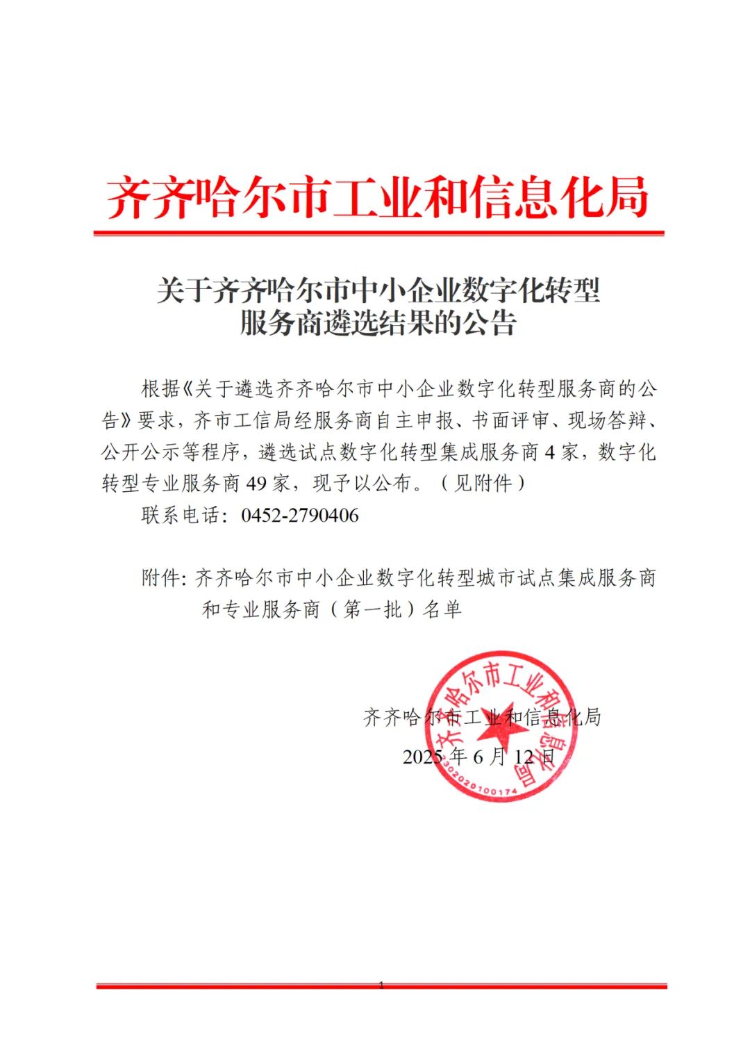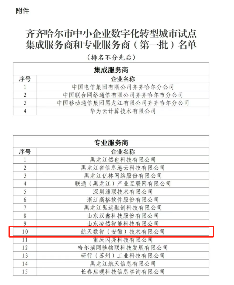 近日,齐齐哈尔市中小企业数字化转型城市试点专业服务商(第一批)名单公示,航天数智成功入选。