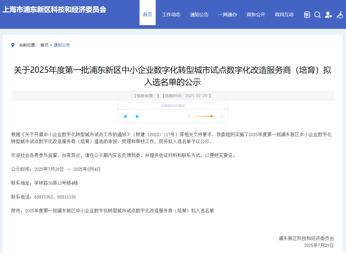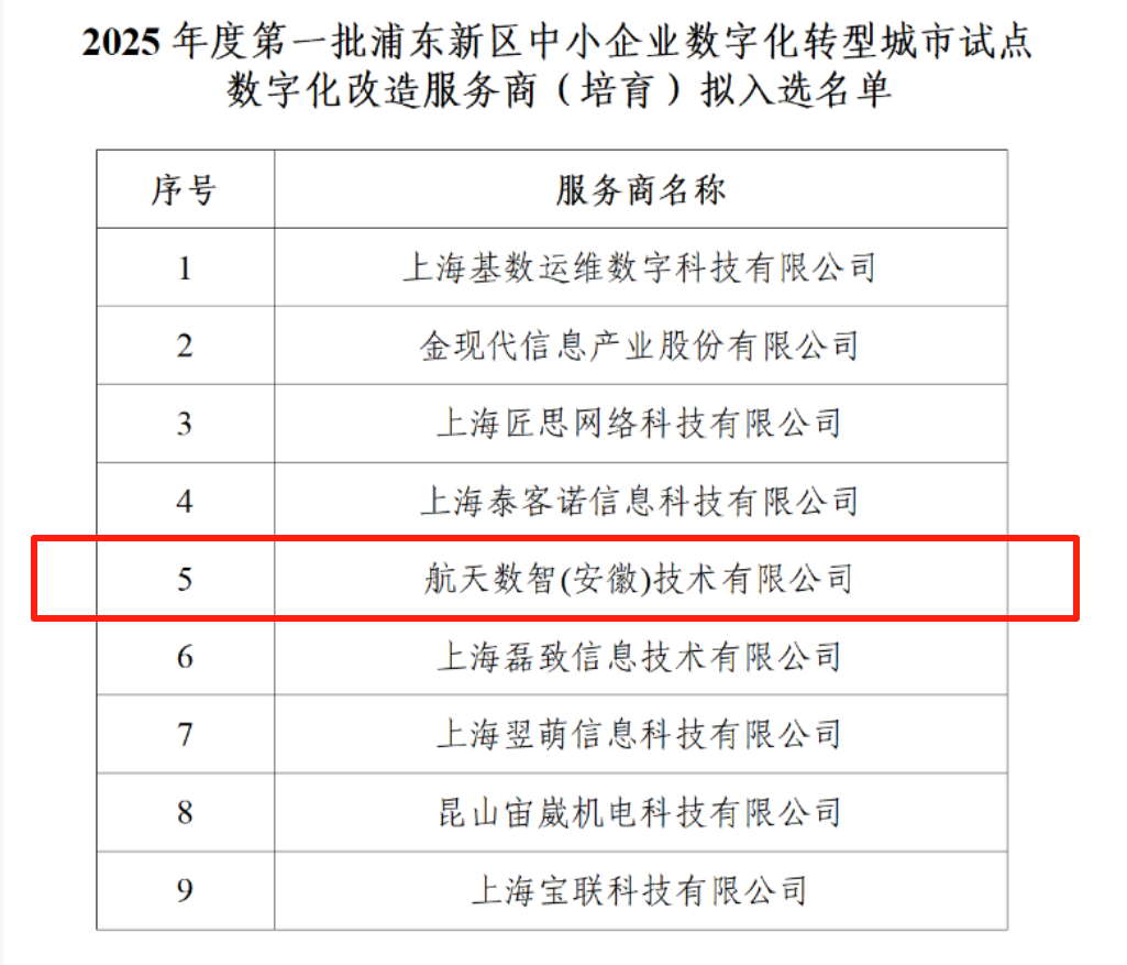 根据上海浦东新区科技和经济委员会7月29日发布的公告,航天数智成功入选“2025年度浦东新区数字化转型服务商名单”,成为首批公布的九家服务商之一。