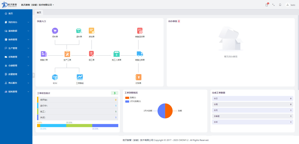 CMOM系统作为航天数智的核心系统产品,系统功能全面、操作简捷、适用广泛,融合轻量ERP、MES、QMS、BPM等核心功能,涵盖仓储作业、设备OEE等典型场景,满足中小企业除财务总账、报表外的绝大部分数字化需求。系统部署便捷、开箱即用,界面简洁流畅,即使信息化基础薄弱的一线人员也能快速上手,在不增加作业负担的同时实现高效数字化管理。